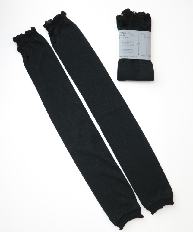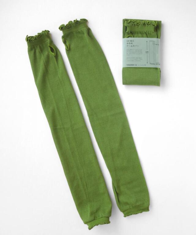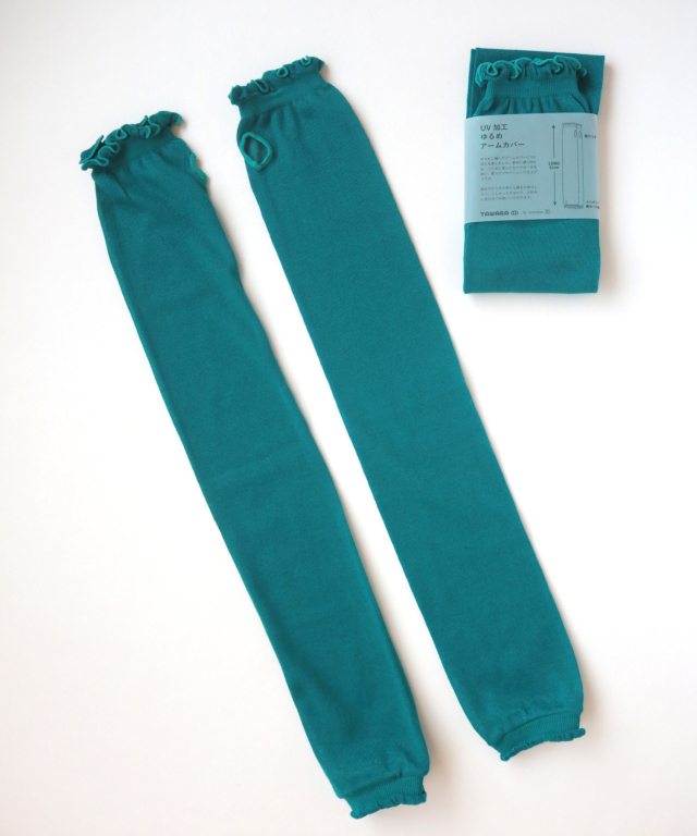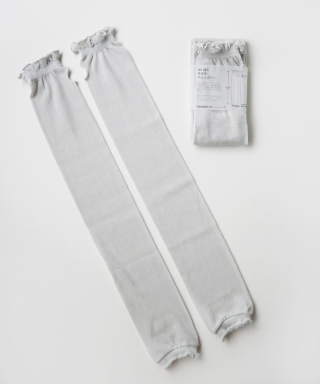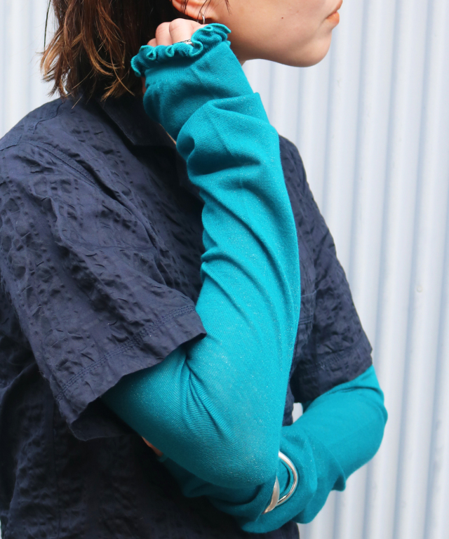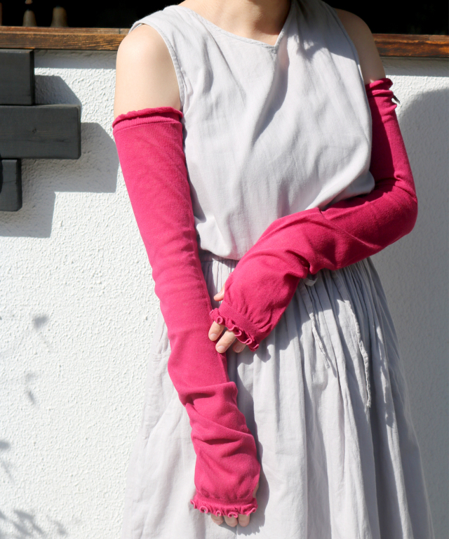 綿100%糸を使ってゆるめに編みたてた、長め仕上げのUV加工アームカバーです。