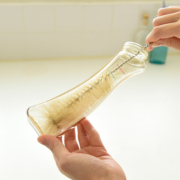 ボトルの隅までしっかり洗えて素材を傷つけない馬毛製の専用ブラシ、
