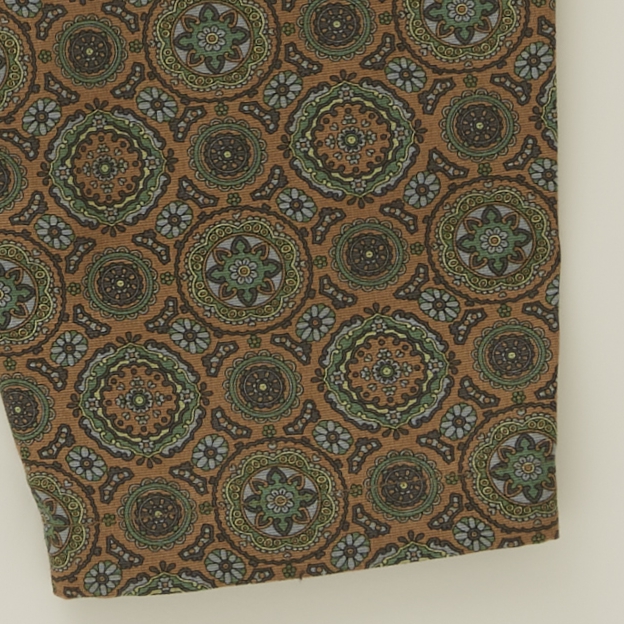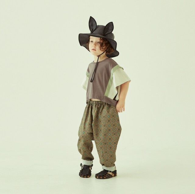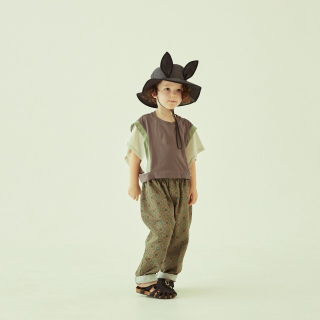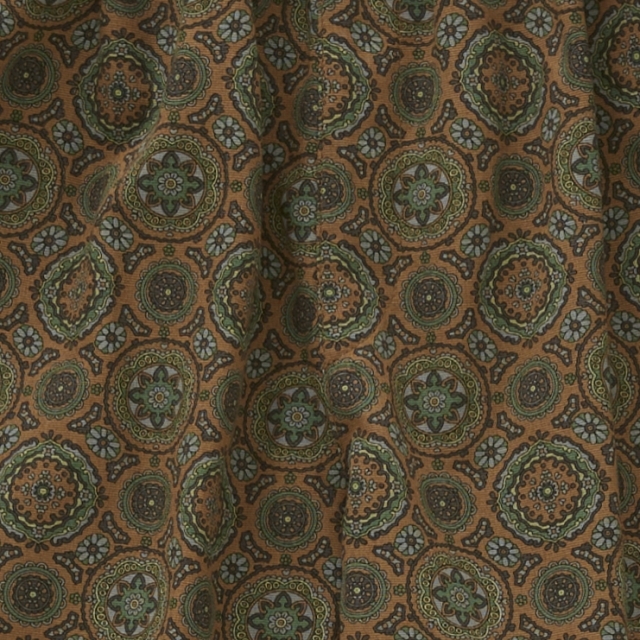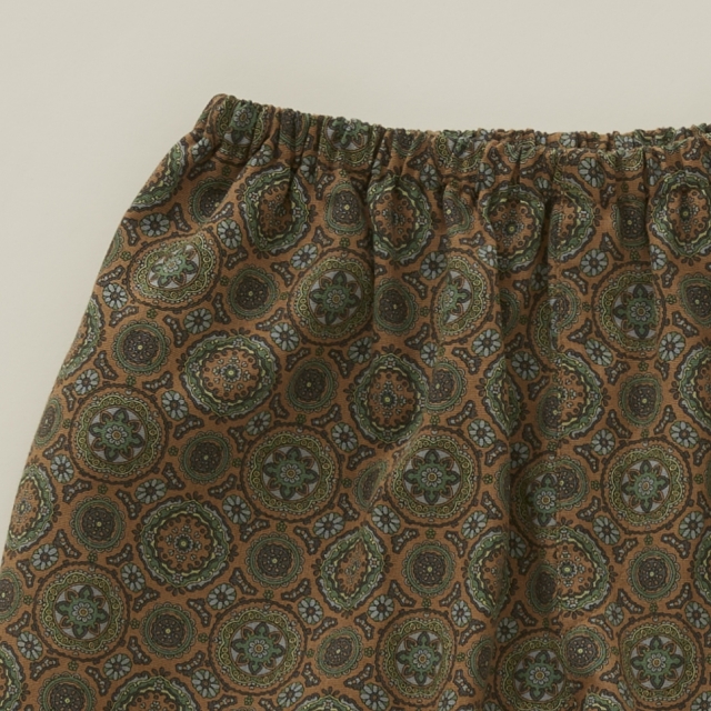 横畝が目立つコットンタッサーにプリントされたメダリオン柄のテキスタイルは、タッサーならではの厚みや張り感があり、コットン100 %でありながらしわになりにくく丈夫な素材。 万華鏡のような配色の美しいメダリオン柄は、夏らしい印象と異国のような雰囲気があり、男女問わず着用いただけるテーパードパンツ