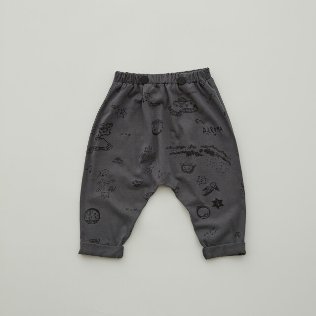 AuRoraの夜空のものがたりtarinaを落書きのように散りばめた図案を、Tシャツ用の天竺生地にプリントしたテキスタイル。 ベビー用にはパンツやフリンジ付きビブもご用意。