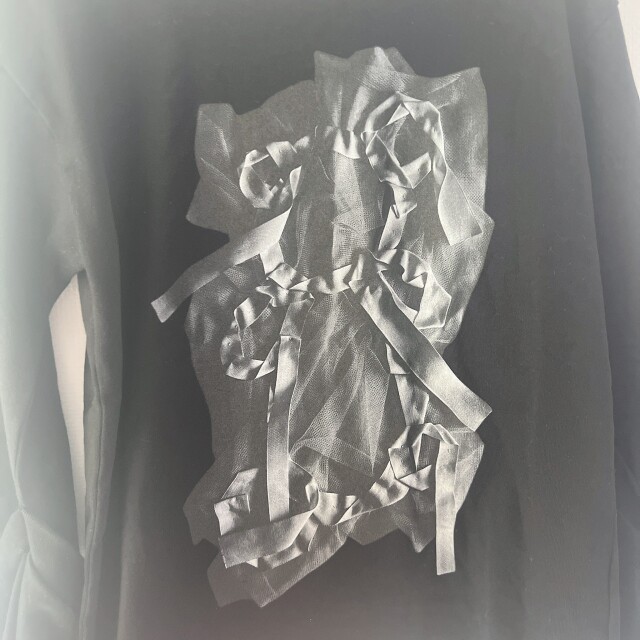 テープとチュールで作ったクマモチーフをインクジェットプリント。袖にスラッシュあきがあり、お肌をチラ見せできるロンT。 大人のみの入荷です。