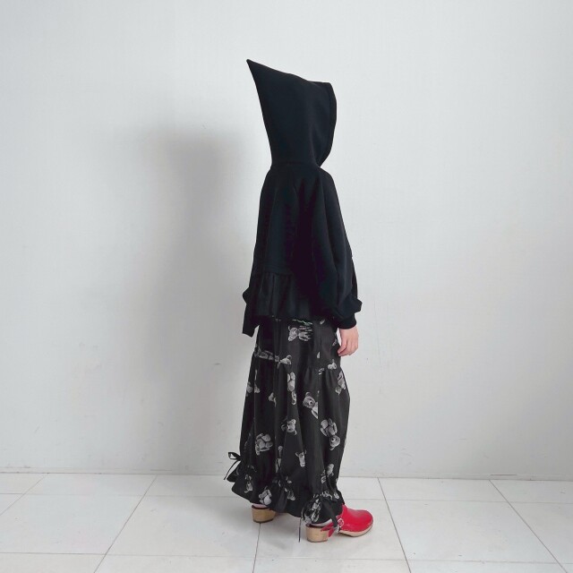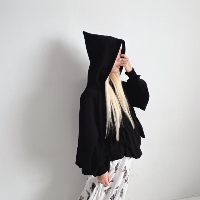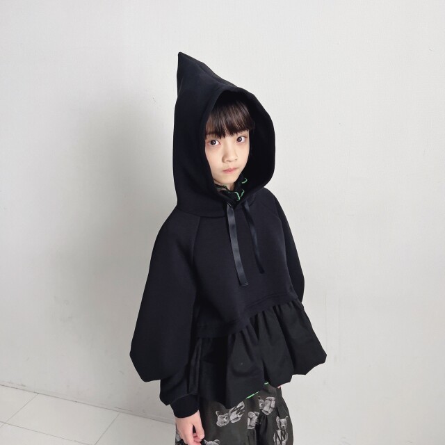 帽子のとんがり部分もfrankygrowらしくかっこいいhoodie。ショート丈の丈感が絶妙なデザイン