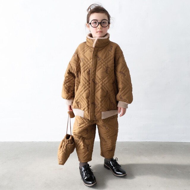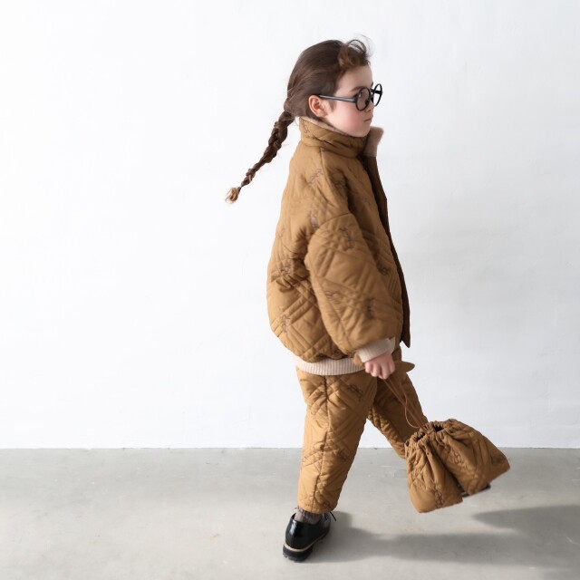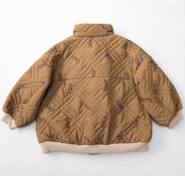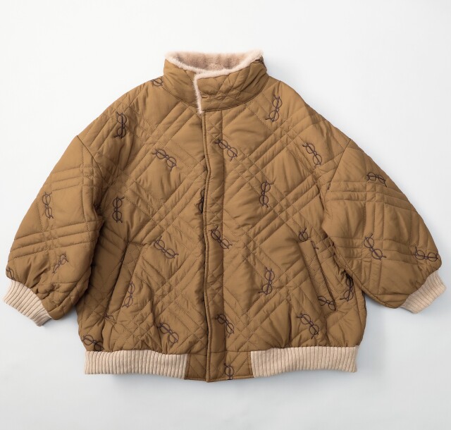 今季オリジナルキルティング、メガネ刺繍総柄です。裏地は生地を作る段階でお付けしています。衿裏のみ肌心地良いファー付きで別布リブは肉厚のコーデュロイニットを使用