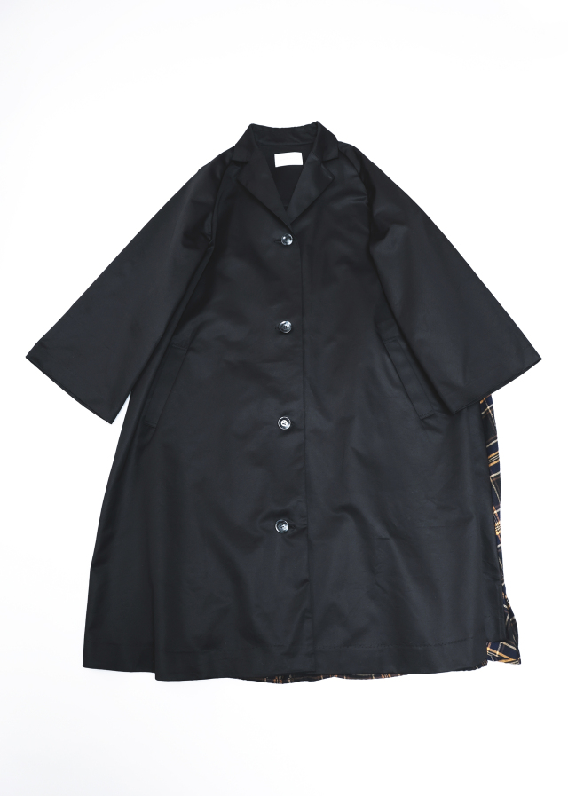 限界まで打ち込んだ高密度ツイルは足袋の底地に使われるほど丈夫で洗うほどに味が出る生地です。こちらの生地をたっぷり使いお作りしました大人のAラインコート。後ろ見頃ヨーク下はタータンチェックに切り替えデザインになります