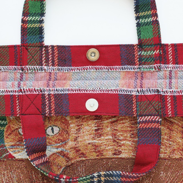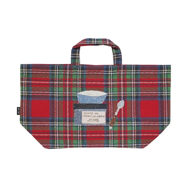 チェック柄をベースに、表に愛らしいネコたち、裏には日々の暮らしの道具たちが描かれています。