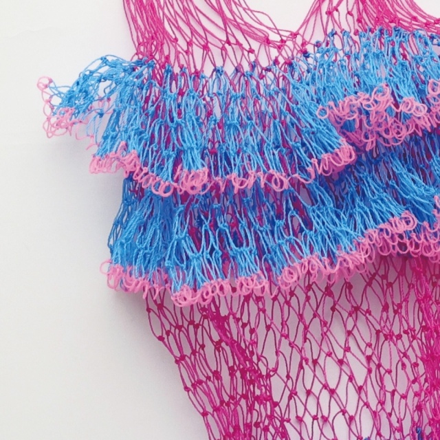 ランブータンの果実を思わせる、フリルが目 を惹く網みバッグ。