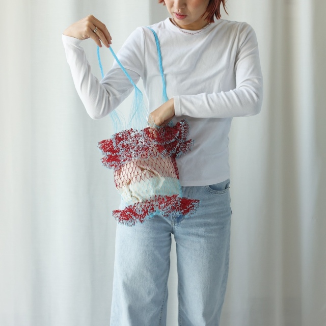 ランブータンの果実を思わせる、フリルが目 を惹く網みバッグ。